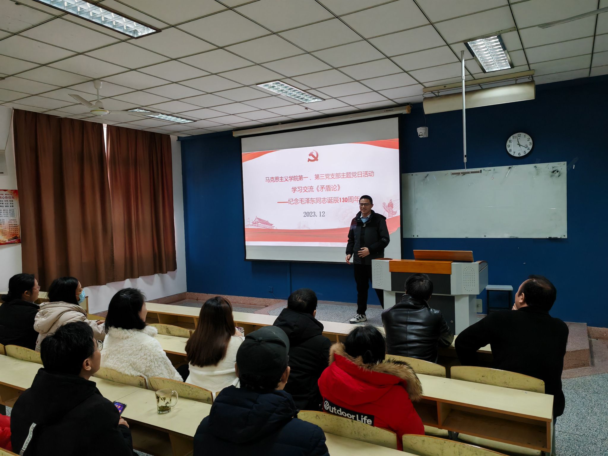 12月27日下午,马克思主义学院第一党支部和第三党支部的党员们齐聚一堂,举办以“纪念毛泽东诞辰130周年”读书分享会为主要内容的联合党日活动,进一步学习与感悟毛泽东的著作所蕴含的丰富思想与时代价值,汲取伟人的智慧,秉承伟人的精神。