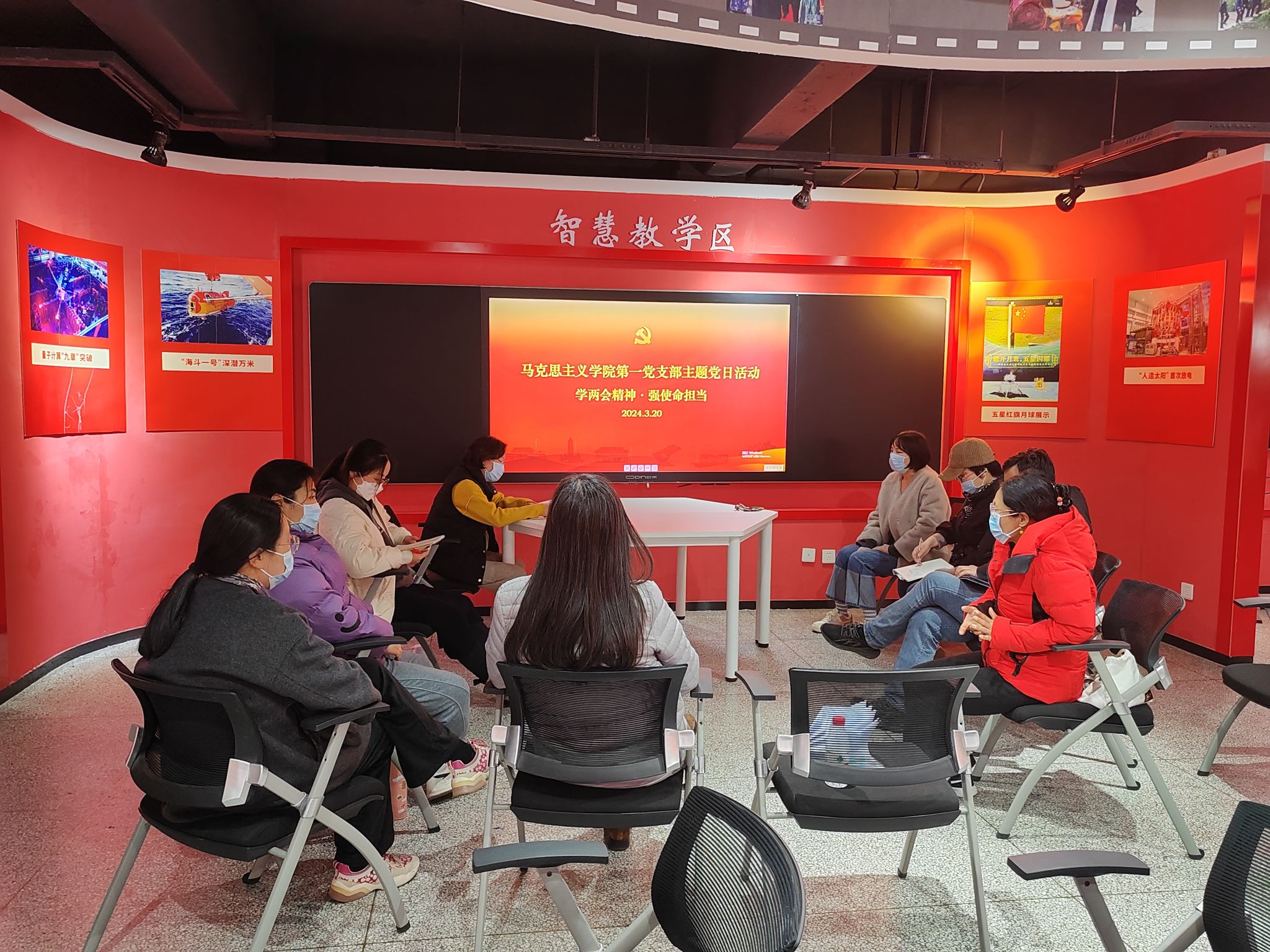 3月20日下午,马克思主义学院第一党支部在新思想践悟馆召开主题党日活动,支部党员在习近平总书记主持召开学校思想政治理论课教师座谈会五周年之际,重温了“3.18”讲话精神,认真学习领会了全国两会精神,热议了新质生产力、依法治国、教育强国等热点话题,并结合自身实际表达对国家繁荣富强的新期待以及对落实立德树人根本任务的新愿景。会议由支部书记刘兵主持。